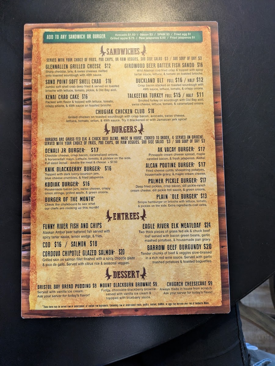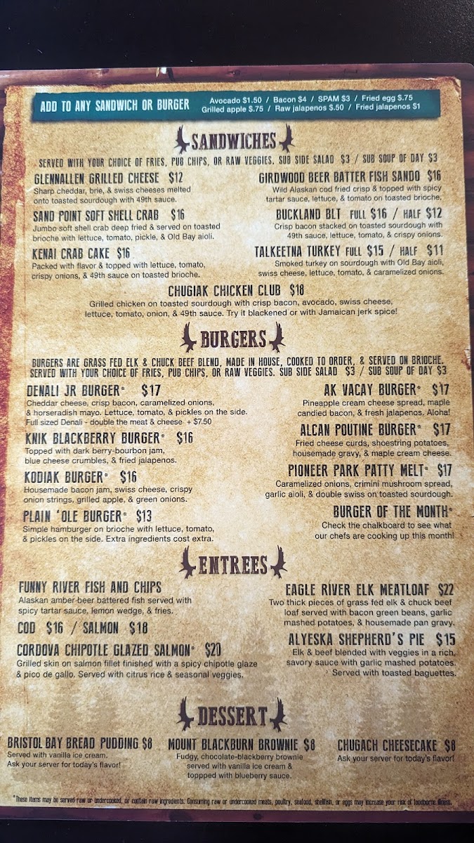 As you peruse their extensive offerings, prepare to be tempted by a selection of enticing burgers. Indulge in the Denali Burger, a mountainous creation featuring two juicy patties, melted cheddar cheese, crisp bacon, sweet caramelized onions, and zesty horseradish mayo, all for just $18. If you’re looking for something a bit smaller but equally satisfying, the Denali Jr is a perfect choice at $13.